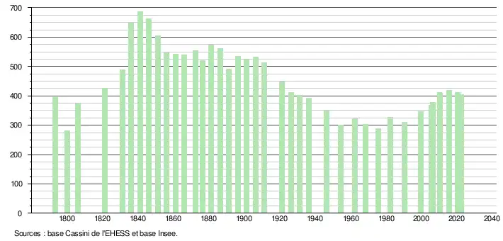 | L'évolution du nombre d'habitants est connue à travers les recensements de la population effectués dans la commune depuis 1793. Pour les communes de moins de 10 000 habitants, une enquête de recensement portant sur toute la population est réalisée tous les cinq ans, les populations de référence des années intermédiaires étant quant à elles estimées par interpolation ou extrapolation[26]. Pour la commune, le premier recensement exhaustif entrant dans le cadre du nouveau dispositif a été réalisé en 2005[27]. En 2022, la commune comptait 404 habitants[Note 5], en évolution de −2,42 % par rapport à 2016 (Tarn : +2,52 %, France hors Mayotte : +2,11 %). |