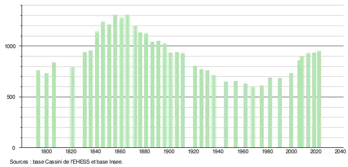 L'évolution du nombre d'habitants est connue à travers les recensements de la population effectués dans la commune depuis 1793. Pour les communes de moins de 10 000 habitants, une enquête de recensement portant sur toute la population est réalisée tous les cinq ans, les populations de référence des années intermédiaires étant quant à elles estimées par interpolation ou extrapolation[19]. Pour la commune, le premier recensement exhaustif entrant dans le cadre du nouveau dispositif a été réalisé en 2008[20].