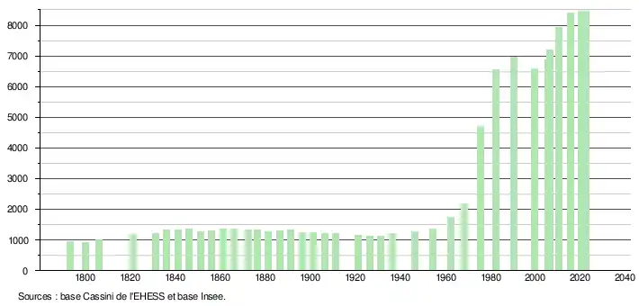 L'évolution du nombre d'habitants est connue à travers les recensements de la population effectués dans la commune depuis 1793. Pour les communes de moins de 10 000 habitants, une enquête de recensement portant sur toute la population est réalisée tous les cinq ans, les populations de référence des années intermédiaires étant quant à elles estimées par interpolation ou extrapolation[34]. Pour la commune, le premier recensement exhaustif entrant dans le cadre du nouveau dispositif a été réalisé en 2005[35].