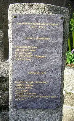 - ↑ Jean Sellin, né le à Trégunc ; il habitait le hameau de Pont-Melan ; déporté depuis Compiègne le .