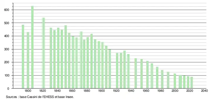 L'évolution du nombre d'habitants est connue à travers les recensements de la population effectués dans la commune depuis 1793. Pour les communes de moins de 10 000 habitants, une enquête de recensement portant sur toute la population est réalisée tous les cinq ans, les populations de référence des années intermédiaires étant quant à elles estimées par interpolation ou extrapolation[41]. Pour la commune, le premier recensement exhaustif entrant dans le cadre du nouveau dispositif a été réalisé en 2007[42].