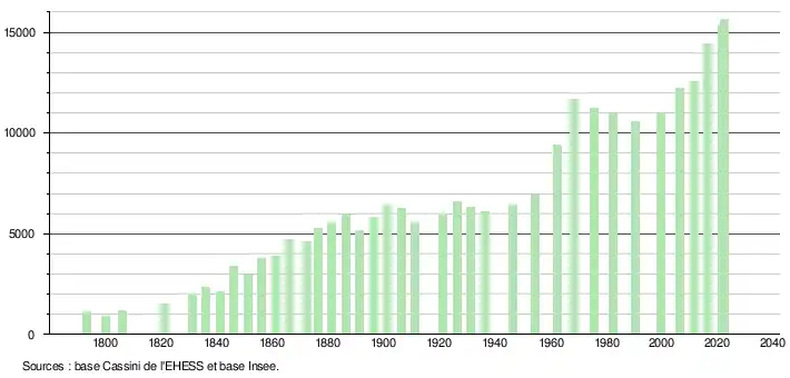 - ↑ Par convention dans Wikipédia, le principe a été retenu de n’afficher dans le tableau des recensements et le graphique, pour les populations de référence postérieures à 1999, que les populations correspondant à une enquête exhaustive de recensement pour les communes de moins de 10 000 habitants, et que les populations des années 2006, 2011, 2016, etc. pour les communes de plus de 10 000 habitants, ainsi que la dernière population de référence publiée par l’Insee pour l'ensemble des communes.