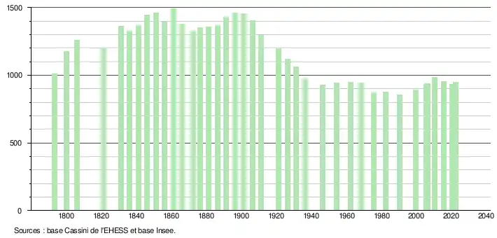 L'évolution du nombre d'habitants est connue à travers les recensements de la population effectués dans la commune depuis 1793. Pour les communes de moins de 10 000 habitants, une enquête de recensement portant sur toute la population est réalisée tous les cinq ans, les populations de référence des années intermédiaires étant quant à elles estimées par interpolation ou extrapolation[35]. Pour la commune, le premier recensement exhaustif entrant dans le cadre du nouveau dispositif a été réalisé en 2005[36].
