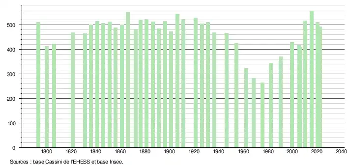 - ↑ Fiches Insee - Populations de référence de la commune pour les années 2006, 2007, 2008, 2009, 2010, 2011, 2012, 2013, 2014, 2015, 2016, 2017, 2018, 2019, 2020, 2021 et 2022.