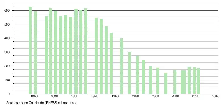 L'évolution du nombre d'habitants est connue à travers les recensements de la population effectués dans la commune depuis 1856. Pour les communes de moins de 10 000 habitants, une enquête de recensement portant sur toute la population est réalisée tous les cinq ans, les populations de référence des années intermédiaires étant quant à elles estimées par interpolation ou extrapolation[39]. Pour la commune, le premier recensement exhaustif entrant dans le cadre du nouveau dispositif a été réalisé en 2008[40].