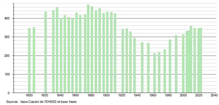 L'évolution du nombre d'habitants est connue à travers les recensements de la population effectués dans la commune depuis 1800. Pour les communes de moins de 10 000 habitants, une enquête de recensement portant sur toute la population est réalisée tous les cinq ans, les populations de référence des années intermédiaires étant quant à elles estimées par interpolation ou extrapolation[24]. Pour la commune, le premier recensement exhaustif entrant dans le cadre du nouveau dispositif a été réalisé en 2004[25].