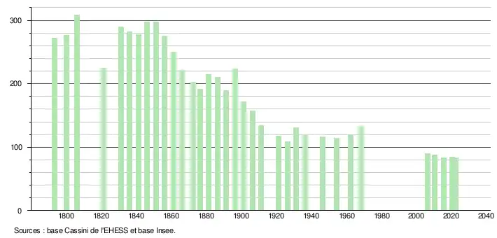 L'évolution du nombre d'habitants est connue à travers les recensements de la population effectués dans la commune depuis 1793. Pour les communes de moins de 10 000 habitants, une enquête de recensement portant sur toute la population est réalisée tous les cinq ans, les populations de référence des années intermédiaires étant quant à elles estimées par interpolation ou extrapolation[15]. Pour la commune, le premier recensement exhaustif entrant dans le cadre du nouveau dispositif a été réalisé en 2005[16].