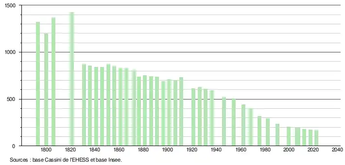 L'évolution du nombre d'habitants est connue à travers les recensements de la population effectués dans la commune depuis 1793. Pour les communes de moins de 10 000 habitants, une enquête de recensement portant sur toute la population est réalisée tous les cinq ans, les populations de référence des années intermédiaires étant quant à elles estimées par interpolation ou extrapolation[15]. Pour la commune, le premier recensement exhaustif entrant dans le cadre du nouveau dispositif a été réalisé en 2007[16].