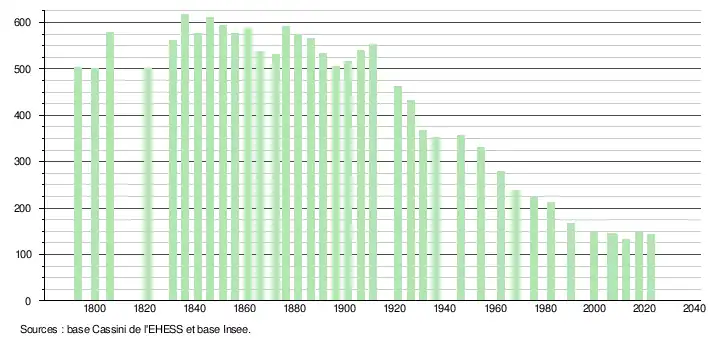 L'évolution du nombre d'habitants est connue à travers les recensements de la population effectués dans la commune depuis 1793. Pour les communes de moins de 10 000 habitants, une enquête de recensement portant sur toute la population est réalisée tous les cinq ans, les populations de référence des années intermédiaires étant quant à elles estimées par interpolation ou extrapolation[22]. Pour la commune, le premier recensement exhaustif entrant dans le cadre du nouveau dispositif a été réalisé en 2007[23].