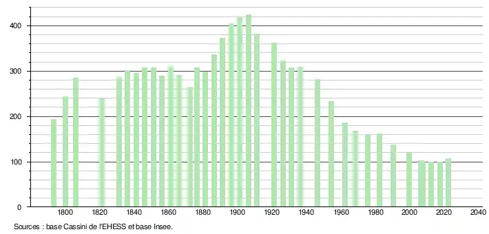 L'évolution du nombre d'habitants est connue à travers les recensements de la population effectués dans la commune depuis 1793. Pour les communes de moins de 10 000 habitants, une enquête de recensement portant sur toute la population est réalisée tous les cinq ans, les populations de référence des années intermédiaires étant quant à elles estimées par interpolation ou extrapolation[29]. Pour la commune, le premier recensement exhaustif entrant dans le cadre du nouveau dispositif a été réalisé en 2007[30].