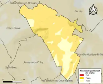 Le retrait-gonflement des sols argileux est susceptible d'engendrer des dommages importants aux bâtiments en cas d’alternance de périodes de sécheresse et de pluie. 79,9 % de la superficie communale est en aléa moyen ou fort (52,8 % au niveau départemental et 48,5 % au niveau national). Sur les 567 bâtiments dénombrés sur la commune en 2019, 501 sont en aléa moyen ou fort, soit 88 %, à comparer aux 70 % au niveau départemental et 54 % au niveau national. Une cartographie de l'exposition du territoire national au retrait gonflement des sols argileux est disponible sur le site du BRGM[18],[Carte 2].