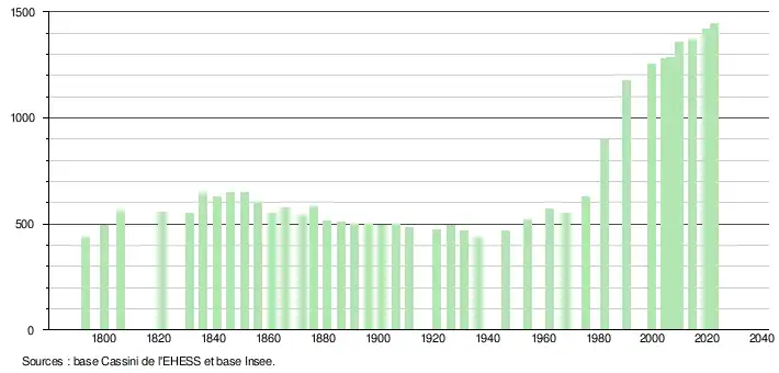 L'évolution du nombre d'habitants est connue à travers les recensements de la population effectués dans la commune depuis 1793. Pour les communes de moins de 10 000 habitants, une enquête de recensement portant sur toute la population est réalisée tous les cinq ans, les populations de référence des années intermédiaires étant quant à elles estimées par interpolation ou extrapolation[24]. Pour la commune, le premier recensement exhaustif entrant dans le cadre du nouveau dispositif a été réalisé en 2004[25].