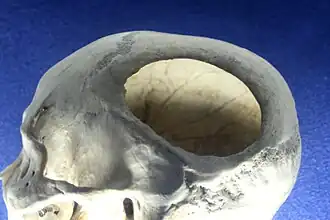 La trépanation est la forme la plus ancienne de chirurgie dont il existe des preuves physiques. L'examen de crânes fossiles montre que des opérations de ce type étaient réalisées dès le Néolithique[1],[2], voire le Mésolithique. Le premier crâne préhistorique trépané est trouvé le 20 septembre 1843 à Crozon par le préhistorien Paul du Chatellier[3]. En 1873, un morceau d’os pariétal ayant probablement servi comme amulette est trouvé dans un dolmen de Lozère par le docteur Barthélémy Prunières, qui est le premier à publier des travaux sur les trépanations préhistoriques et à utiliser le terme de « trépanation », terme ensuite fixé et mieux défini par Paul Broca[4]. Des cas de double trépanation guérie sont également mis en évidence à cette époque[5]. Trois méthodes étaient utilisées[6]. Trois techniques d'extraction du « volet de trépanation » étaient utilisées : trépanation verticale (térébration avec un couteau de silex) ; horizontale (rainurage circonscrivant un volet ovalaire et curetage de l’os avec un racloir) ; élimination de roulette (en délimitant, avec des petits trous pratiqués à l’aide d’un poinçon ou d'une meule, une zone qui était ensuite éliminée par nécrose ou au moyen d’un levier)[7]. Les chirurgiens devaient beaucoup s'exercer (dans un site néolithique vendéen, une trépanation faite sur un crâne de vache évoque une expérimentation sur l'animal[8]) car une étude sur 130 crânes trépanés de la grotte-aven des Baumes-Chaudes montre que 70 % des individus ayant subi la trépanation avaient survécu (trépanations cicatrisées, voire trou résorbé par régénération de l'os)[9].