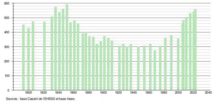 L'évolution du nombre d'habitants est connue à travers les recensements de la population effectués dans la commune depuis 1793. Pour les communes de moins de 10 000 habitants, une enquête de recensement portant sur toute la population est réalisée tous les cinq ans, les populations de référence des années intermédiaires étant quant à elles estimées par interpolation ou extrapolation[15]. Pour la commune, le premier recensement exhaustif entrant dans le cadre du nouveau dispositif a été réalisé en 2005[16].