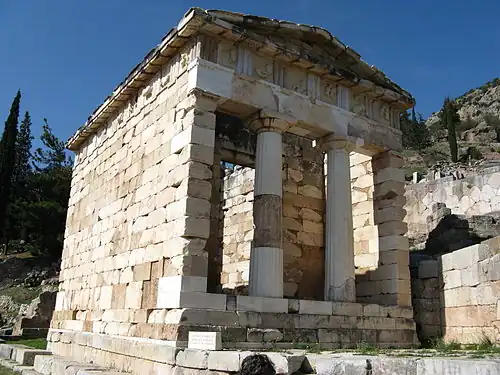 - (en) William Bell Dinsmoor, « Studies of the Delphian treasuries. II : The four Ionic treasuries. », Bulletin de correspondance hellénique, vol. 37, , p. 5-83 (DOI 10.3406/bch.1913.3131, lire en ligne, consulté le ).