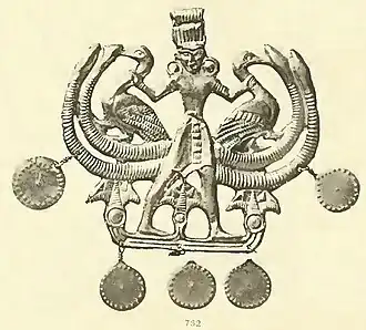 Les objets les plus élaborés de ce trésor sont un pendentif de poitrine et une paire de boucles d'oreilles. Le pendentif semble représenter un dieu crétois flanqué de deux oies dans un champ. Derrière lui apparaissent deux cornes de taureaux sacrés. Le dieu se rapporte aux figures du Maître des animaux que l'on trouve dans de nombreux arts du Proche-Orient ancien. La paire de boucles d'oreilles est conçue en forme de serpents à deux têtes qui encerclent deux paires de lévriers qui se font face.