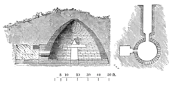 La salle principale de la tombe à tholos, de plan circulaire[2], est recouverte d'un assemblage de blocs de pierres, placés en encorbellement, taillés et polis pour donner l'impression d'une voûte[6] : les blocs sont disposés en rangées horizontales, qui diminuent au fur et à mesure, de même que la dimension des blocs[2]. La salle est creusée dans la terre meuble d'une colline basse, les blocs sont placés par en haut[2].