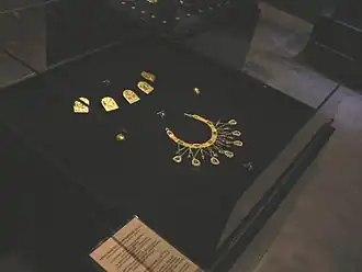 Le trésor se compose de 170 pièces d'or et d'objets précieux. Les pierres précieuses sont des rubis, des grenats et des cristaux de roche. Le sommet de l'art des bijoux médiévaux est considéré comme le collier double face, qui pèse 227 grammes. Il se compose de sept carreaux avec des images trapézoïdales reliées par de l'or finement tissé. Chaque tuile a un anneau avec une chaîne se terminant par un médaillon en forme de larme. L'autre élément le plus précieux est le diadème doré avec des griffons. Il y a une hypothèse que certains des articles sont des éléments d'un deuxième collier en or[5].