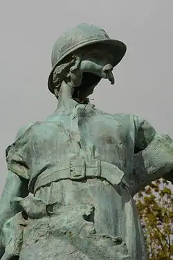 - Le monument aux morts de la guerre de 1914-1918 est une statue casquée personnifiant la Victoire. Sculptée par l'ancien maire Edmond de Laheudrie et inaugurée le , elle porte la trace des combats pour la libération de 1944[56]. Un obus tiré depuis Omaha a emporté le visage de la statue de bronze qui est restée dans son état jusqu'à nos jours. Sur le monument, une plaque rappelle la bataille de Normandie. Devenue un symbole des gueules cassées, l'œuvre a été copiée pour être placée à l'entrée du National D-Day memorial (en) de Bedford (Virginie) ; baptisée The lady of Trévières, elle est inaugurée par le président George W. Bush le [57],[58],[59].