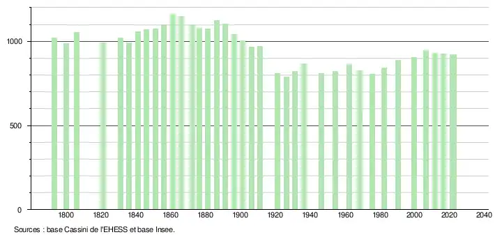 L'évolution du nombre d'habitants est connue à travers les recensements de la population effectués dans la commune depuis 1793. Pour les communes de moins de 10 000 habitants, une enquête de recensement portant sur toute la population est réalisée tous les cinq ans, les populations de référence des années intermédiaires étant quant à elles estimées par interpolation ou extrapolation[41]. Pour la commune, le premier recensement exhaustif entrant dans le cadre du nouveau dispositif a été réalisé en 2006[42].