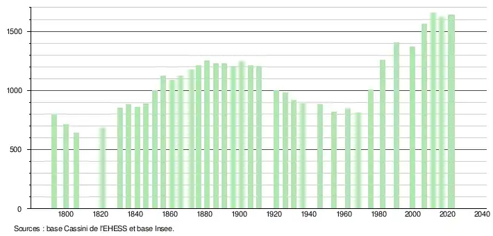 L'évolution du nombre d'habitants est connue à travers les recensements de la population effectués dans la commune depuis 1793. Pour les communes de moins de 10 000 habitants, une enquête de recensement portant sur toute la population est réalisée tous les cinq ans, les populations de référence des années intermédiaires étant quant à elles estimées par interpolation ou extrapolation[18]. Pour la commune, le premier recensement exhaustif entrant dans le cadre du nouveau dispositif a été réalisé en 2006[19].