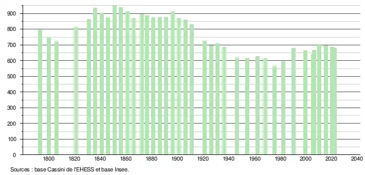 L'évolution du nombre d'habitants est connue à travers les recensements de la population effectués dans la commune depuis 1793. Pour les communes de moins de 10 000 habitants, une enquête de recensement portant sur toute la population est réalisée tous les cinq ans, les populations de référence des années intermédiaires étant quant à elles estimées par interpolation ou extrapolation[21]. Pour la commune, le premier recensement exhaustif entrant dans le cadre du nouveau dispositif a été réalisé en 2005[22].