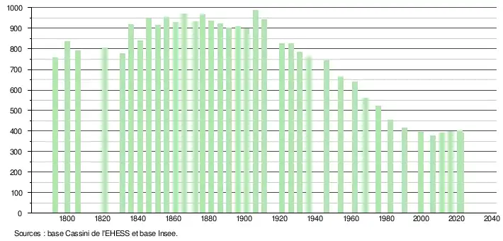L'évolution du nombre d'habitants est connue à travers les recensements de la population effectués dans la commune depuis 1793. Pour les communes de moins de 10000habitants, une enquête de recensement portant sur toute la population est réalisée tous les cinqans, les populations de référence des années intermédiaires étant quant à elles estimées par interpolation ou extrapolation[25]. Pour la commune, le premier recensement exhaustif entrant dans le cadre du nouveau dispositif a été réalisé en 2006[26].