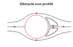 Avec un corps non profilé symétrique, comme un cylindre, ce décollement produit deux tourbillons symétriques (image ci-dessus). Une faible augmentation de la vitesse privilégie l'un des deux et, lorsque son diamètre devient de l'ordre du diamètre du cylindre, il se détache pour être remplacé par un tourbillon situé de l'autre côté, ce qui donne naissance à une allée de tourbillons de Karman. Une plus forte augmentation du nombre de Reynolds transforme le sillage tourbillonnaire organisé en un sillage désorganisé. Dans les deux cas, les vitesses des particules fluides sont augmentées à l'aval du corps, ce qui entraîne une chute de la pression donc une augmentation de la traînée.