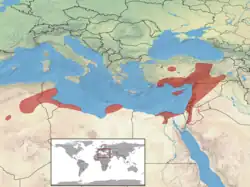 Cette espèce se rencontre en Algérie, en Tunisie, en Libye, dans le nord de l'Égypte, à Chypre, en Turquie, en Syrie, en Israël, au Liban, en Jordanie, en Irak et dans l'ouest de l'Iran[1].
