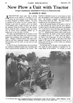 En Irlande, l'homme d'affaires Harry Ferguson développe et vend différentes amélioration, accessoires, et tracteurs depuis les années 1910. Ses premiers tracteurs sont adaptés de la voiture Modèle T. En 1920 et 1921, il a fait des démonstrations à Cork et à Dearborn de ses accessoires, comme pièces jointes à des tracteurs Fordson. Les dispositifs d'attelage sont mécanique à l'époque. En 1926, lui et une équipe d'anciens collègues (y compris Willie Sables et Archie Greer) développent un bon attelage hydraulique à trois points d'attache. Ferguson place ses accessoires sur des tracteurs Fordsons au cours des années 1920 et au début des années 1930. Au milieu des années 1930, David Brown Ltd construit des tracteurs de la marque Ferguson avec ses accessoires. En 1938, Eber Sherman, importateur des Fordsons anglais aux États-Unis et ami de Ford et de Ferguson, s'arrange pour que Ferguson puisse démontrer son tracteur à Henry Ford[1]. En , la démonstration devant Ford et ses ingénieurs a lieu. Il était léger par rapport à sa puissance, ce qui impressionna Ford. La démonstration de Ferguson conduit à un accord "poignée de main" avec Ford en 1938, où Ford s'engage à fabriquer des tracteurs munis de l'attelage trois points de Ferguson.