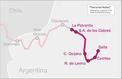 Entre la gare de Salta et le col Paso Socompa, à la frontière avec le Chili au travers de la Cordillère des Andes, la branche C-14 du chemin de fer Belgrano, connue populairement comme Tren de las Nubes ou Tren a las Nubes parcourt de très hautes montagnes, avec des sections situées au-dessus de 4 000 mètres, et propose aux voyageurs un spectacle de toute beauté.