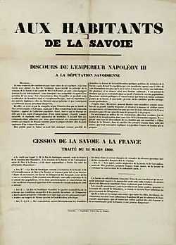 En mars 1860, cependant, alors que le Piémont était en train d'annexer l'Émilie et la Toscane, Napoléon III accepta de sanctionner les acquisitions italiennes du Piémont en échange de Nice et de la Savoie. La France a annexé les provinces par les dispositions du traité de Turin, signé le 24 mars 1860. Il s'est ensuivi un plébiscite profondément vicié à Nice les 15 et 16 avril et en Savoie les 22 et 23 avril, au cours duquel "apparemment et sans aucun doute" la grande majorité des habitants des deux territoires ont voté pour approuver le traité et rejoindre la France. La France prend formellement possession de Nice et de la Savoie le 12 juin 1860. Le vote est cependant profondément influencé par l'accord antérieur entre les autorités savoyardes-piémontaises et la France, faisant même des autorités savoyardes une part active dans la promotion d'un résultat favorable à la France : de nombreux Niçards sont exclus, pour diverses raisons, des listes électorales, tandis que sont inscrits de nombreux Français spécialement transférés, et les opérations se déroulent sous le contrôle des autorités françaises et avec la présence dans la ville de troupes françaises[12] ne pas faire douter : par exemple, 119 marins niçois, stationnés sur les navires savoyards dans les différents ports, qui pouvaient voter librement, se sont exprimés ainsi : 114 pour rester en Italie et 5 pour passer en France[13]. Cet événement a provoqué l'exode niçard, ou l'émigration d'un quart des Italiens niçards vers l'Italie[14].