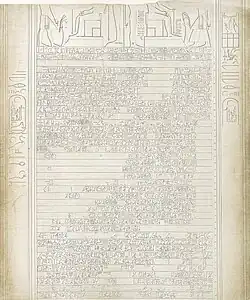 - Une version égyptienne écrite en hiéroglyphes a survécu grâce à deux inscriptions. L'une d'elles a été trouvé sur le mur extérieur ouest de la cour de la cachette dans le temple d'Amon à Karnak[2]. Il reproduit non seulement le texte du traité, mais rend également compte de la conclusion du traité lui-même et des scellés apposés sur le panneau. L'autre inscription est très fragmentaire et a été gravée sur la tour ouest du pylône extérieur du Ramesséum à Thèbes Ouest[2]. Il est généralement admis par la recherche que la version du traité égyptien comporte certaines inexactitudes par rapport au texte original. D'une part, les troisième et quatrième colonnes du texte du traité ont probablement été permutées lors des inscriptions, c'est pourquoi les lignes 32 et suivantes suivent la ligne 24 et les lignes 25 à 31 apparaissent en encart[3]. D'autre part, le texte du contrat suit la propagande du souverain égyptien, le grand roi Hattusili III, qui était l'égal du pharaon, étant rétrogradé au simple rang de roitelet[4].