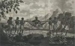 Après une année passée au Havre, Tati s’embarque pour Malimbe le 8 janvier 1768[69]. Ici il fait fortune en devenant courtier, comme son père avant lui. Le capitaine malouin Louis de Grandpré avec qui traite Tati en 1786, nous fournit les informations biographiques et le portrait de Tati dans son Voyage à la côte occidentale de l’Afrique fait dans les années 1786 et 1787[70]. Tati est représenté dans l’acte de se faire amener en tipoye par des porteurs et arborant un bonnet de raphia, signe de notabilité, et des colliers. Quatre années plus tard, en 1790, il est toujours un intermédiaire privilégié de la traite, comme l’attestent les 22 mentions qui sont faites de lui dans le cahier de troc du navire négrier bordelais La Manette[71].