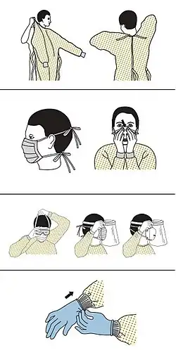 - ↑ « Sequence for Putting On Personal Protective Equipment (PPE) » [archive du ], Centers for Disease Control and Prevention (CDC) (consulté le )