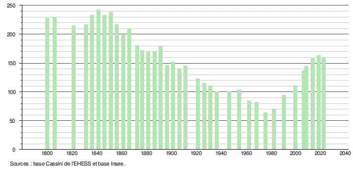 L'évolution du nombre d'habitants est connue à travers les recensements de la population effectués dans la commune depuis 1800. Pour les communes de moins de 10 000 habitants, une enquête de recensement portant sur toute la population est réalisée tous les cinq ans, les populations de référence des années intermédiaires étant quant à elles estimées par interpolation ou extrapolation[18]. Pour la commune, le premier recensement exhaustif entrant dans le cadre du nouveau dispositif a été réalisé en 2008[19].
