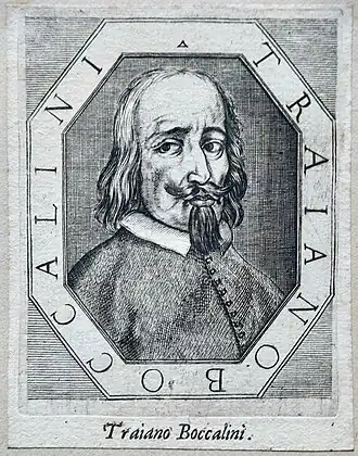 Trajano Boccalini, né en à Loreto, dans l'actuelle province d'Ancône, dans les Marches et mort le à Venise[1], est un écrivain et un auteur satirique italien de la seconde moitié du XVIe et du début du XVIIe siècle.