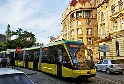 Tatra KT4: le Tatra KT4 est une rame articulée produite par ČKD et lancée en 1977. La ville compte deux types de ces rames, des rames destinées à l'Union soviétique typées KT4SU, livrées entre 1980 et 1988, et des rames destinées à l'Allemagne de l'Est typées KT4D, livrées dans les années 2000[5]. La ville reçoit un premier lot de deux rames en 1976, identifiées initialement par les numéros 1 et 2 puis renumérotées 1001 et 1002[5]; elles sont les premières rames de ce type à être mises en service, et leur exploitation à Lviv sert de période d'essai avant une production en série. Un total de 145 véhicules de ce type a ensuite été livré entre 1981 et 1990, numérotés de 1001 à 1145[5]. En 2007 et 2008, la ville récupère 22 véhicules de types KT4D, initialement utilisées pour les réseaux de tramway des villes d'Erfurt et de Gera, en Allemagne[5].