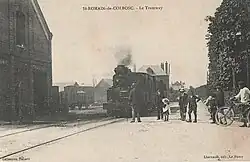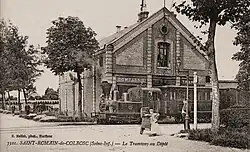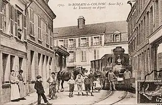Le dossier fut transmis au Conseil général qui l'accueillit favorablement dans sa séance du 29 août 1894, autorisant la mise à l'enquête du projet et acceptant le principe d'une participation financière du département pour l'établissement de la ligne[2]. Malgré‚ l'opposition de certaines communes, qui auraient souhaité, lors de l'enquête d'utilité publique, la traction hippomobile pour favoriser l'élevage des chevaux dans le canton ou qui craignaient l'encombrement de la voie publique par le tramway, le sort de la petite voie ferrée évolua favorablement. Une société, au capital de 100 000 francs, la Compagnie du Tramway de Saint-Romain-de-Colbosc, était fondée et tenait sa première assemblée générale le 17 août 1895, choisissant comme président M. Benoist, un notable local ; ce même mois, les voitures étaient commandées auprès des établissements Serpollet[5]. En février 1896, les travaux, commencés l'automne précédent, étaient déjà bien avancés, la petite ville était transformée en chantier, une scierie à vapeur avait été installée pour débiter les traverses, une partie des voies était posée, certains bâtiments achevés, comme le dépôt ou la gare de Saint-Romain-Ville. Les premiers essais des automotrices Serpollet débutèrent les premiers jours de mai[6]. Le tramway put commencer son exploitation le 18 mai 1896.