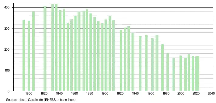 L'évolution du nombre d'habitants est connue à travers les recensements de la population effectués dans la commune depuis 1793. Pour les communes de moins de 10 000 habitants, une enquête de recensement portant sur toute la population est réalisée tous les cinq ans, les populations de référence des années intermédiaires étant quant à elles estimées par interpolation ou extrapolation[20]. Pour la commune, le premier recensement exhaustif entrant dans le cadre du nouveau dispositif a été réalisé en 2005[21].
