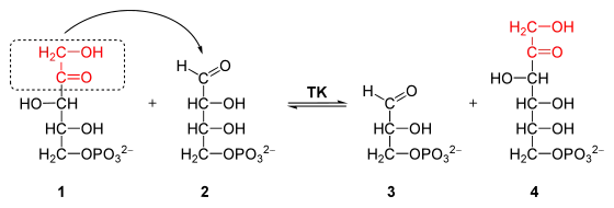 - Dans la première réaction catalysée par la transcétolase dans la voie des pentoses phosphates, la thiamine pyrophosphate accepte un fragment à deux atomes de carbone du D-xylulose-5-phosphate, un cétose à cinq atomes de carbone, et transfère ce fragment au D-ribose-5-phosphate, un aldose à cinq atomes de carbone, pour former du sédoheptulose-7-phosphate, un cétose à sept atomes de carbone, ainsi que du glycéraldéhyde-3-phosphate, un aldose à trois atomes de carbone ; dans le cycle de Calvin, la transcétolase catalyse la réaction inverse, c'est-à-dire la conversion du sédoheptulose-7-phosphate et du glycéraldéhyde-3-phosphate en ribose-5-phosphate et xylulose-5-phosphate, ce qui constitue la seconde intervention de cette enzyme dans cette voie métabolique.