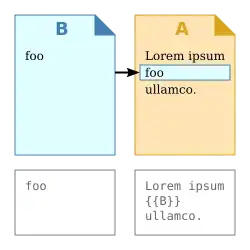 - (en) Cet article est partiellement ou en totalité issu de l’article de Wikipédia en anglais intitulé « Transclusion » (voir la liste des auteurs).