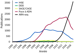 Le RNA-Seq peut être utilisé pour identifier les gènes d'un génome, ou identifier les gènes actifs à un instant T, et le nombre de lectures peut servir à modéliser avec précision le niveau relatif d'expression des gènes. La méthodologie du RNA-Seq a constamment progressé, principalement grâce au développement des technologies de séquençage de l'ADN pour augmenter le débit, la précision et la longueur des lectures[58]. Depuis les premières descriptions en 2006 et 2008[41], le séquençage de l'ARN a été rapidement adopté et a supplanté les puces à ADN comme technique transcriptomique dominante en 2015[36].