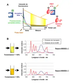 Lors d’un transfert d’énergie entre un donneur possédant une durée de vie de fluorescence longue et un accepteur fluorescent, ce dernier émettra un signal de fluorescence présentant une durée de vie apparente similaire à celle du donneur[23],[24]. Ainsi, l’utilisation des cryptates de terre rare permet de mesurer l’émission de fluorescence de l’accepteur en temps résolu (intégration du signal après un délai de 50 µs pendant 350 µs) (Figure 6.A). Cette propriété permet de distinguer la fluorescence de l’accepteur engagé dans un FRET (durée de vie longue) de la fluorescence de l’accepteur libre (durée de vie courte ~ ns) et des fluorescences parasites émises par les biomolécules présentes dans les milieux biologiques (~ ns).