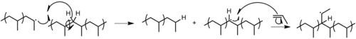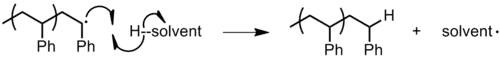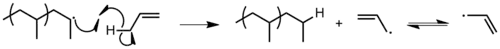- Transfert au polymère. Une chaîne croissante peut faire un transfert de chaîne à une autre chaîne polymère déjà existante. Ceci arrive surtout en présence d'une grande concentration de polymère, soit à la fin d'une polymérisation radicalaire lorsque le monomère est presque consommé. Un polymère ramifié est formé lorsque le monomère s'ajoute au nouveau site radicalaire sur le squelette polymère. Les propriétés du polyéthylène basse densité dépendent de façon critique du nombre de transferts de chaîne au polymère.