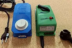 La variation de la tension de sortie s'obtient par un curseur sélectionnant un nombre de spires du bobinage secondaire du transformateur[1], curseur solidaire du bouton extérieur de réglage de la tension et donc de la vitesse du moteur.