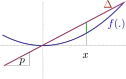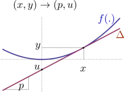 Une autre façon de représenter une fonction, que l'on suppose convexe pour l'instant, est d'utiliser non pas l'intégrale, mais la dérivée de la fonction. On se donne une droite de pente p pour laquelle on va chercher le point où la droite est tangente à la courbe de la fonction. On repère l'ordonnée à l'origine u où la droite croise l'axe y. Etant donné la fonction convexe f, à chaque valeur de p correspond une valeur de u, ce que l'on peut noter par :