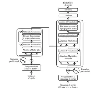 La fonction de chaque encodeur est de traiter sa séquence d'entrée pour générer des encodages contenant de l'information sur les entrées qui sont pertinentes entre elles. Il passe son ensemble d'encodages à l'encodeur suivant. Chaque décodeur réalise l'opération inverse, en prenant et traitant tous les encodages, puis en utilisant l'information contextuelle qui y est présente pour générer la séquence de sortie. A cette fin, chaque encodeur et décodeur utilisent un mécanisme d'attention, qui, pondère la pertinence de chaque lexème de l'entrée par rapport à chaque autre lexème de l'entrée et en élabore de l'information en conséquence pour produire la sortie[7]. Chaque couche du décodeur met aussi en œuvre un mécanisme d'attention qui extrait de l'information des sorties des précédents décodeurs, avant que la couche du décodeur n'extraie de l'information des flux encodés. L'encodeur et le décodeur contiennent tous les deux un réseau de neurones à propagation avant pour un traitement additionnel des sorties, des connexions résiduelles, ainsi qu'une couche de normalisation.