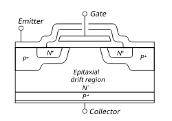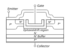 La structure d’un IGBT est basée sur celle d’un MOSFET vertical doublement diffusé[8] : l’épaisseur du support est utilisée pour séparer le drain de la source. Les épaisseurs typiques des wafers sont de l'ordre de 70 à 100 µm. Une zone dite d'épitaxie, dopée N-, permet l'apparition d'un canal lorsque des électrons sont injectés par la grille (VG>0, état passant).
