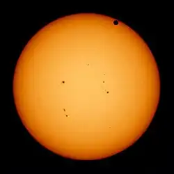 Un transit de Vénus devant le Soleil se produit lors du passage de la planète Vénus exactement entre la Terre et le Soleil, occultant une petite partie du disque solaire. Pendant le transit, Vénus peut être observée depuis la Terre sous la forme d'un petit disque noir se déplaçant devant le Soleil. La durée de tels transits est en général de quelques heures (celui de 2004 dura 6 heures). Un transit est similaire à une éclipse solaire par la Lune, mais bien que Vénus fasse presque quatre fois la taille de la Lune, elle apparaît bien plus petite du fait de la distance plus importante la séparant de la Terre ; et également de sa plus grande proximité avec le Soleil. Avant l'ère spatiale, l'observation de transits de Vénus aida les scientifiques à calculer la distance Terre-Soleil par la méthode de la parallaxe. La distance entre le Soleil et Vénus vaut 0,72 UA. Les transits de Vénus font partie des phénomènes astronomiques prévisibles les moins fréquents et se produisent actuellement suivant une séquence qui se répète tous les 243 ans, avec des paires de transits espacés de 8 ans séparées par 121,5 puis 105,5 ans. Avant 2004, la paire de transits précédente date de décembre 1874 et décembre 1882. Le premier de la paire de transits du début du XXIe siècle a eu lieu le 8 juin 2004 et le suivant a eu lieu le 6 juin 2012. Après 2012, les prochains transits auront lieu en 2117 et 2125[1].